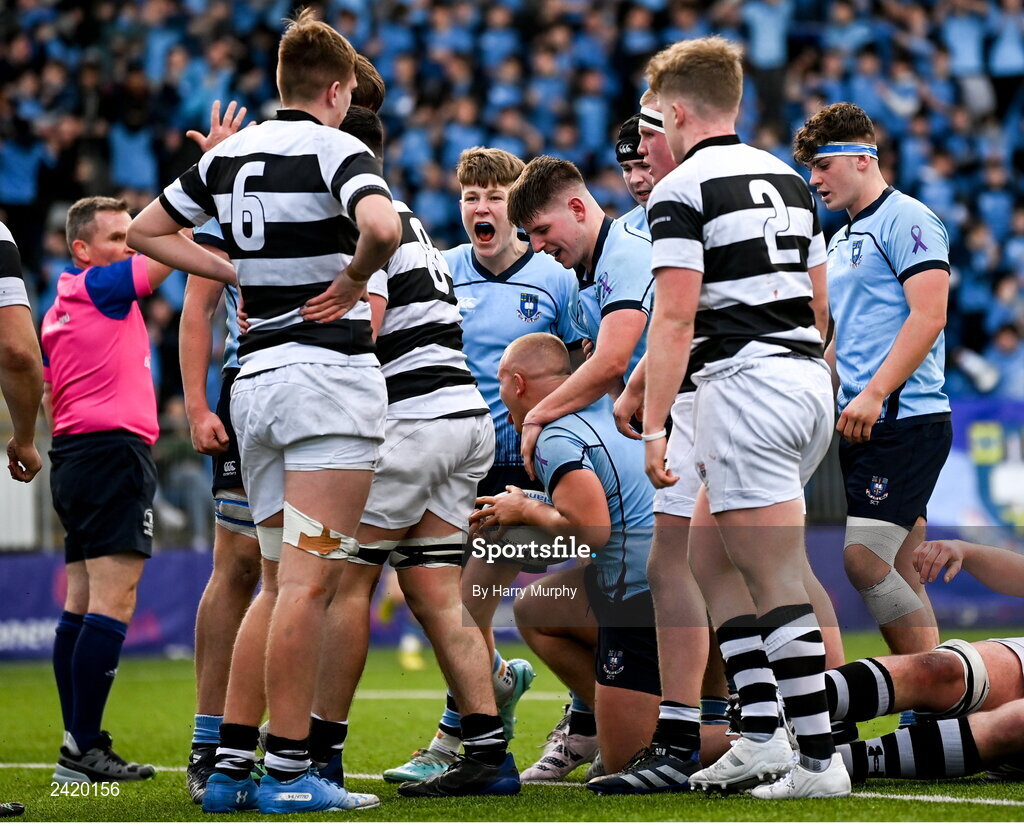 29 January 2023; Tom Stewart of St Michael's College celebrates after scoring his side's second try with teammates during the Bank of Ireland Leinster Rugby Schools Senior Cup First Round match between St Michael’s College and Belvedere College at Energia Park in Dublin. Photo by Harry Murphy/Sportsfile