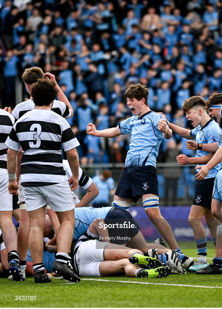 29 January 2023; David Walsh of St Michael's College celebrates his side's first try during the Bank of Ireland Leinster Rugby Schools Senior Cup First Round match between St Michael’s College and Belvedere College at Energia Park in Dublin. Photo by Harry Murphy/Sportsfile
