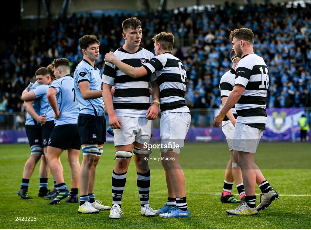 29 January 2023; Alan Spicer and Morgan McMahon of Belvedere College after their side's defeat in the Bank of Ireland Leinster Rugby Schools Senior Cup First Round match between St Michael’s College and Belvedere College at Energia Park in Dublin. Photo by Harry Murphy/Sportsfile