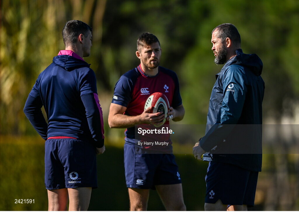 1 February 2023; Ireland head coach Andy Farrell speaks to Jonathan Sexton and Ross Byrne during Ireland rugby squad training at The Campus in Quinta da Lago, Portugal. Photo by Harry Murphy/Sportsfile