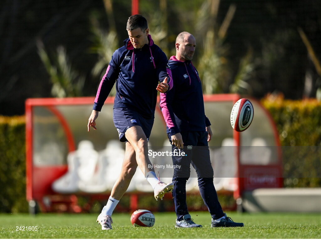 1 February 2023; Jonathan Sexton, left, and Ireland assistant coach Mike Catt during Ireland rugby squad training at The Campus in Quinta da Lago, Portugal. Photo by Harry Murphy/Sportsfile