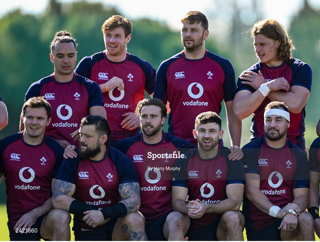 1 February 2023; Ireland players back row, from left, James Lowe, Ryan Baird, Iain Henderson and Cian Prendergast, front row, from left, Jacob Stockdale, Andrew Porter, Mack Hansen, Hugo Keenan and Dave Kilcoyne during Ireland rugby squad training at The Campus in Quinta da Lago, Portugal. Photo by Harry Murphy/Sportsfile