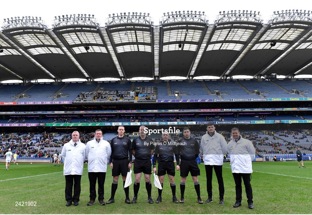 22 January 2023; Referee Johnny Murphy with his match officials before the AIB GAA Hurling All-Ireland Senior Club Championship Final match between Shamrocks Ballyhale of Kilkenny and Dunloy Cúchullain's of Antrim at Croke Park in Dublin. Photo by Piaras Ó Mídheach/Sportsfile