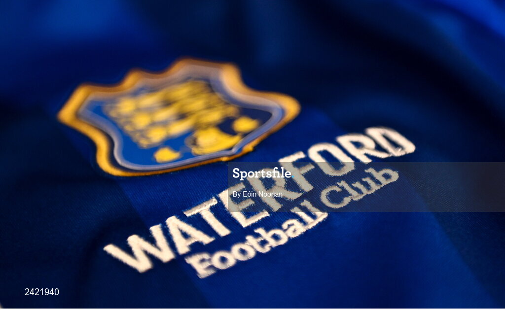 1 February 2023; A detailed view of the Waterford crest before a Waterford FC squad portrait session at RSC in Waterford. Photo by Eóin Noonan/Sportsfile