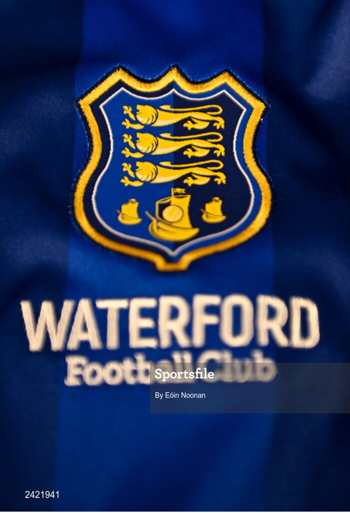 1 February 2023; A detailed view of the Waterford crest before a Waterford FC squad portrait session at RSC in Waterford. Photo by Eóin Noonan/Sportsfile