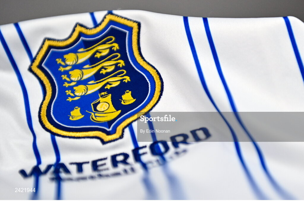 1 February 2023; A detailed view of the Waterford crest before a Waterford FC squad portrait session at RSC in Waterford. Photo by Eóin Noonan/Sportsfile
