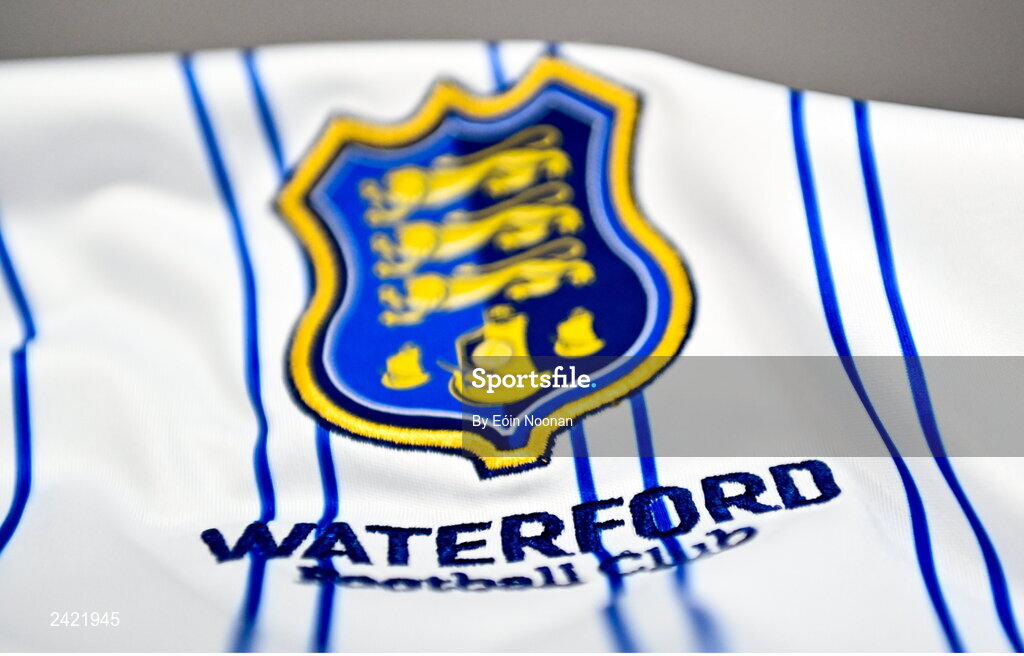 1 February 2023; A detailed view of the Waterford crest before a Waterford FC squad portrait session at RSC in Waterford. Photo by Eóin Noonan/Sportsfile