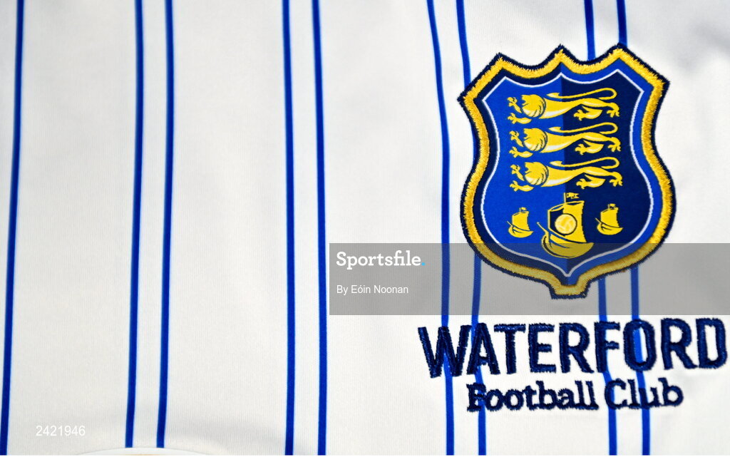 1 February 2023; A detailed view of the Waterford crest before a Waterford FC squad portrait session at RSC in Waterford. Photo by Eóin Noonan/Sportsfile