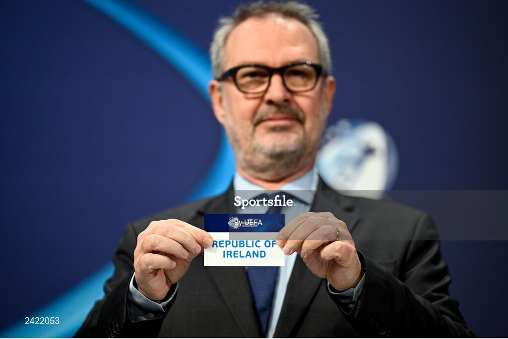 2 February 2023; UEFA Chief of Men's Football & Deputy Director Lance Kelly draws out the card of Republic of Ireland during the UEFA European Under-21 Championship 2025 Qualifying Round Draw at the UEFA headquarters, The House of European Football in Nyon, Switzerland. Photo by Kristian Skeie - UEFA/UEFA via Sportsfile