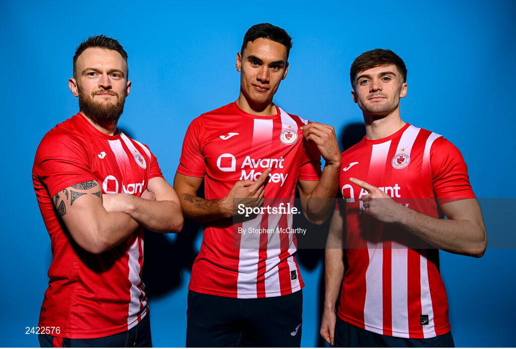 2 February 2023; Players, from left, David Cawley, Max Mata and Niall Morahan pose for a portrait during a Sligo Rovers squad portrait session at The Showgrounds in Sligo. Photo by Stephen McCarthy/Sportsfile