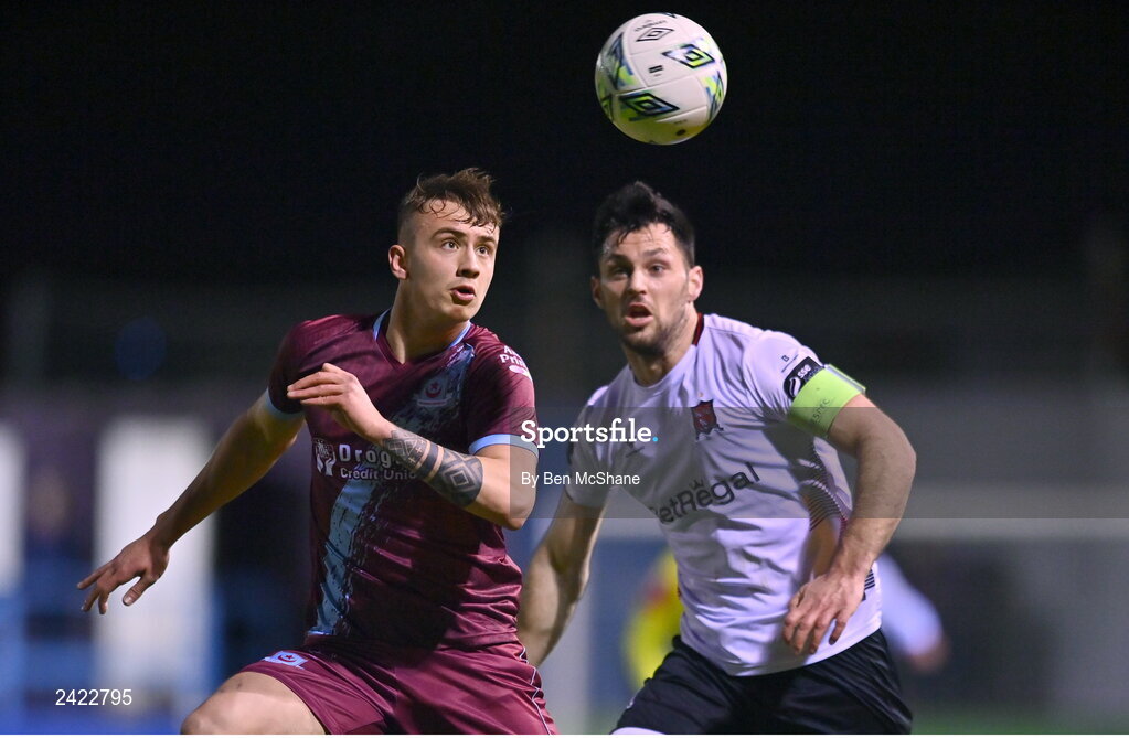 3 February 2023; Ben Curtis of Drogheda United in action against Patrick Hoban of Dundalk during the Jim Malone Cup match between Drogheda United and Dundalk at Weaver's Park in Drogheda, Louth. Photo by Ben McShane/Sportsfile