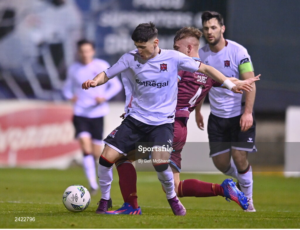 3 February 2023; Ryan O'Kane of Dundalk in action against Ben Curtis of Drogheda United during the Jim Malone Cup match between Drogheda United and Dundalk at Weaver's Park in Drogheda, Louth. Photo by Ben McShane/Sportsfile