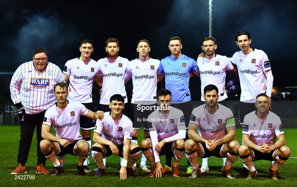 3 February 2023; The Dundalk team, back row, from left, John Martin, Connor Malley, Hayden Muller, goalkeeper Peter Cherrie, Andy Boyle and Louis Annesley. Front row, from left, Greg Sloggett, Ryan O'Kane, Archie Davies, captain Patrick Hoban and Keith Ward, with Dundalk supporter Killian Moran, left, before the Jim Malone Cup match between Drogheda United and Dundalk at Weaver's Park in Drogheda, Louth. Photo by Ben McShane/Sportsfile