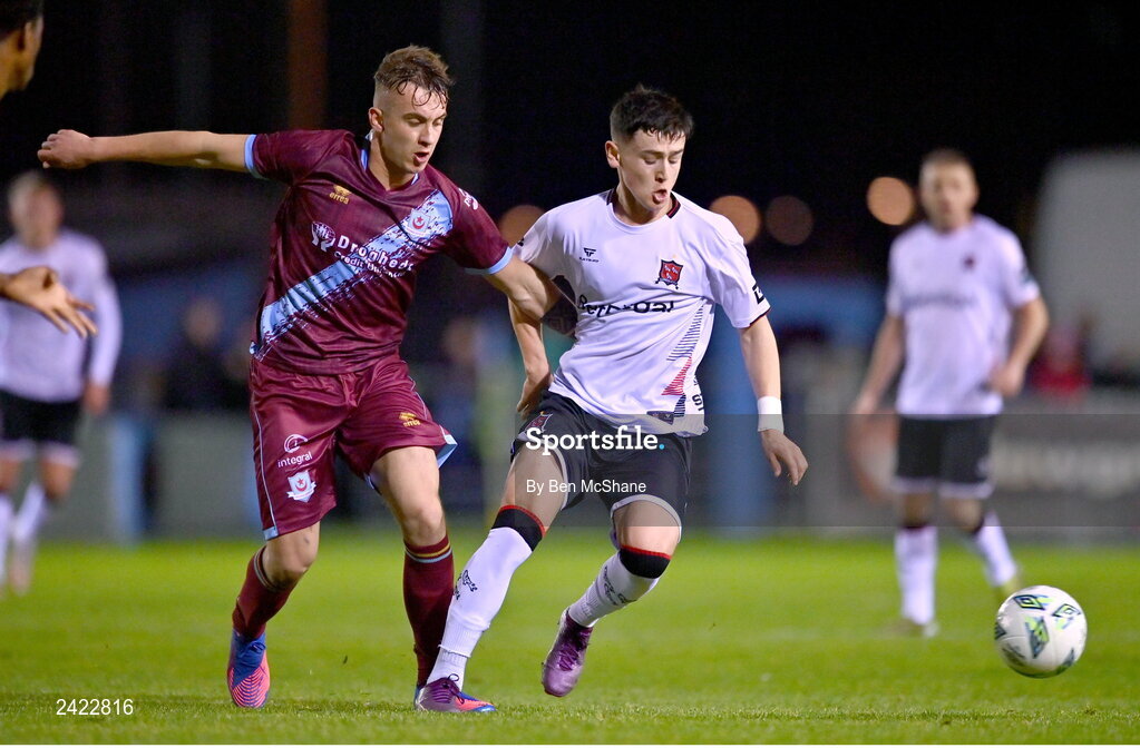 3 February 2023; Ryan O'Kane of Dundalk in action against Ben Curtis of Drogheda United during the Jim Malone Cup match between Drogheda United and Dundalk at Weaver's Park in Drogheda, Louth. Photo by Ben McShane/Sportsfile