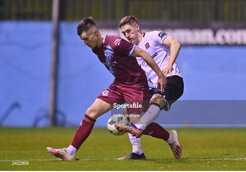 3 February 2023; Evan Weir of Drogheda United in action against John Martin of Dundalk during the Jim Malone Cup match between Drogheda United and Dundalk at Weaver's Park in Drogheda, Louth. Photo by Ben McShane/Sportsfile