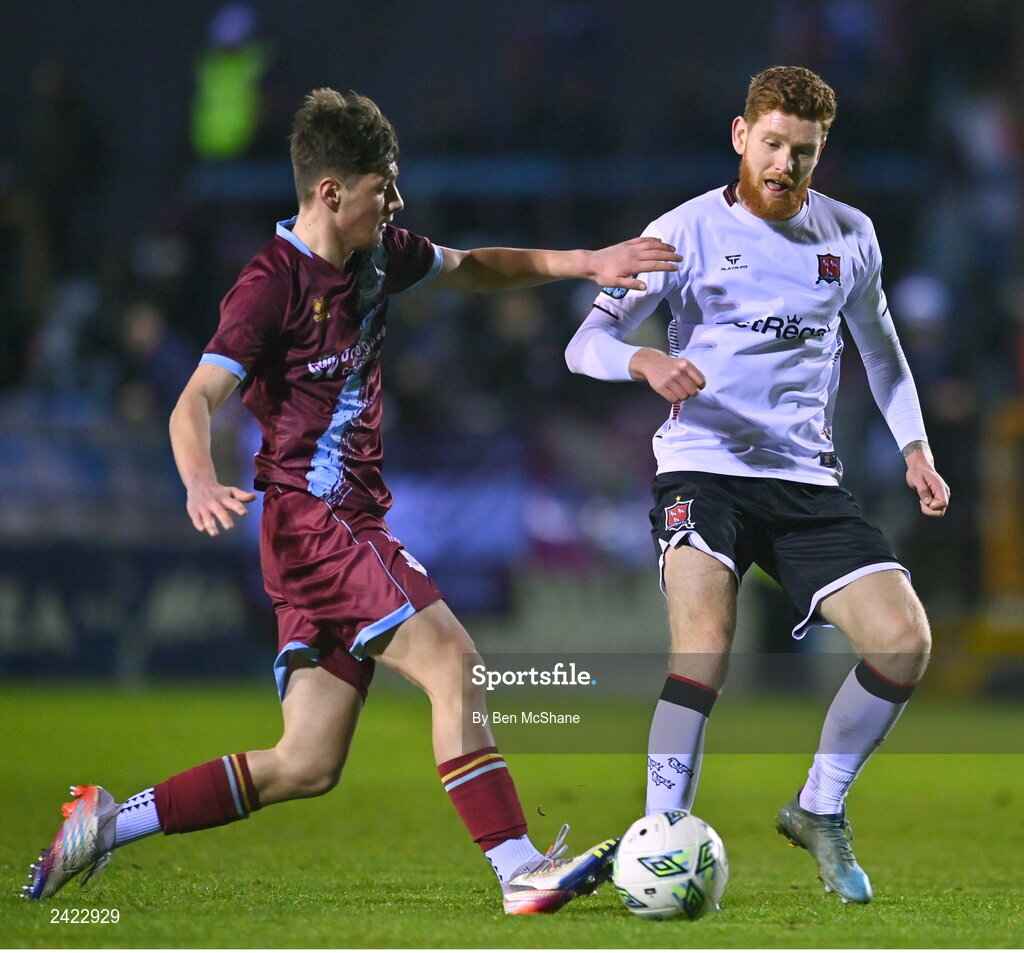 3 February 2023; Connor Malley of Dundalk in action against Emre Topcu of Drogheda United during the Jim Malone Cup match between Drogheda United and Dundalk at Weaver's Park in Drogheda, Louth. Photo by Ben McShane/Sportsfile