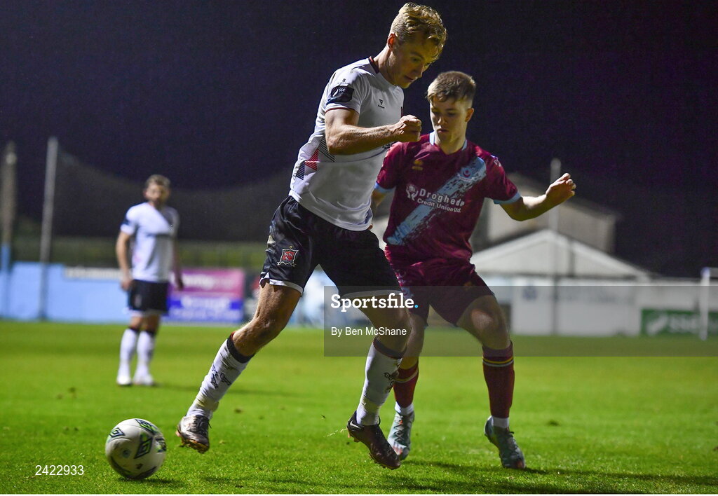 3 February 2023; Greg Sloggett of Dundalk in action against Warren Davis of Drogheda United during the Jim Malone Cup match between Drogheda United and Dundalk at Weaver's Park in Drogheda, Louth. Photo by Ben McShane/Sportsfile