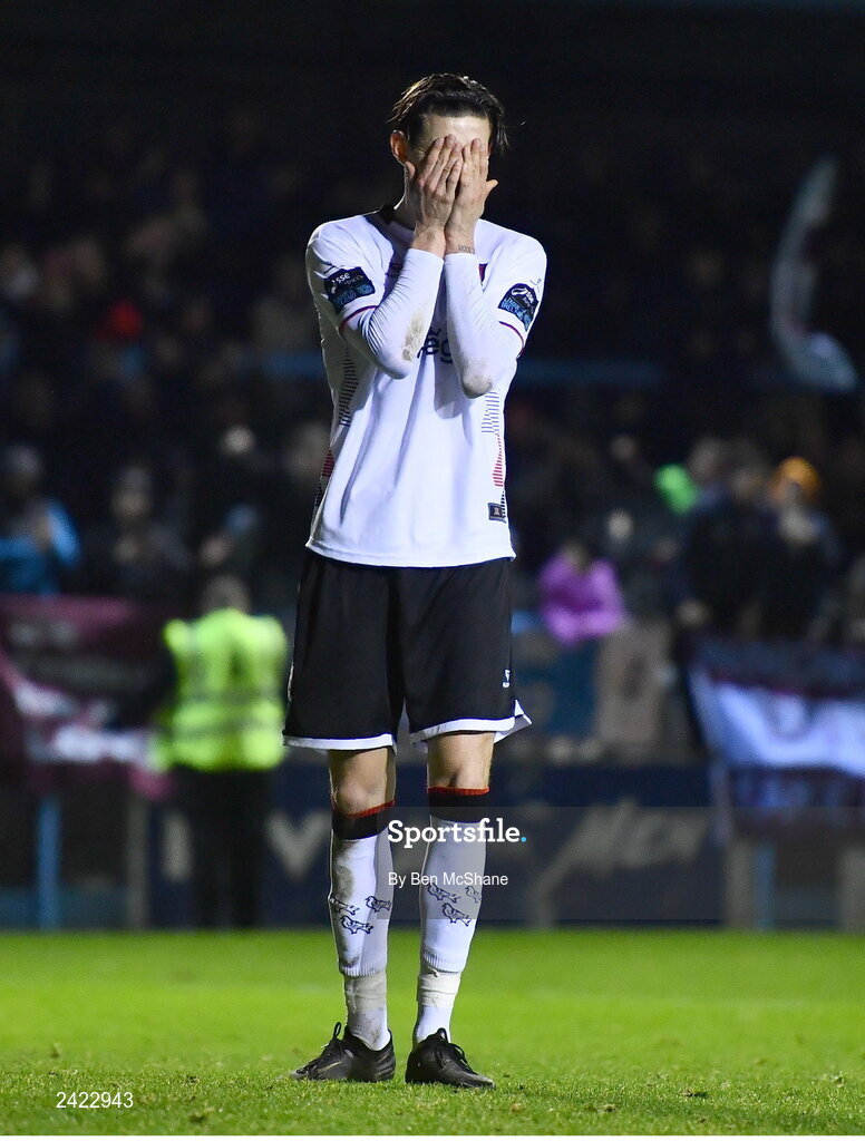 3 February 2023; Louis Annesley of Dundalk reacts after missing a penalty in the penalty shootout after the Jim Malone Cup match between Drogheda United and Dundalk at Weaver's Park in Drogheda, Louth. Photo by Ben McShane/Sportsfile
