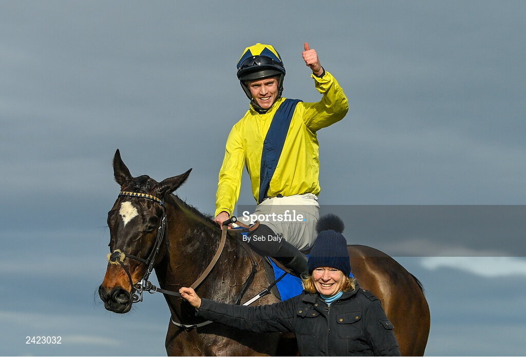 4 February 2023; Jockey Michael O'Sullivan celebrates after winning the Nathaniel Lacy and Partners Solicitors Novice Hurdle on Good Land during day one of the Dublin Racing Festival at Leopardstown Racecourse in Dublin. Photo by Seb Daly/Sportsfile