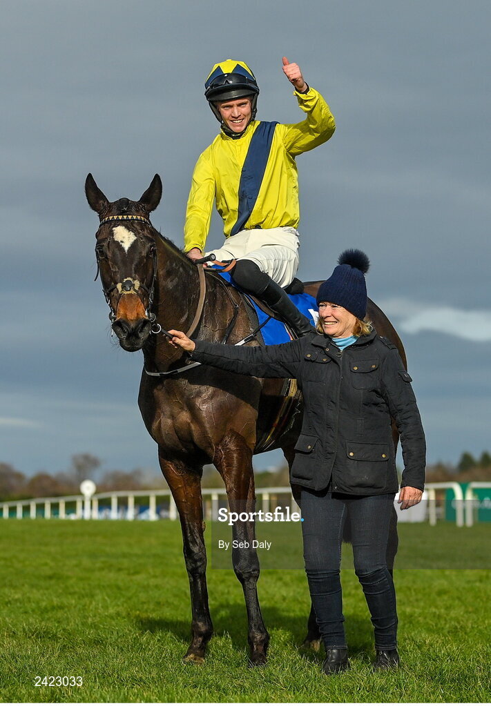 4 February 2023; Jockey Michael O'Sullivan celebrates after winning the Nathaniel Lacy and Partners Solicitors Novice Hurdle on Good Land during day one of the Dublin Racing Festival at Leopardstown Racecourse in Dublin. Photo by Seb Daly/Sportsfile