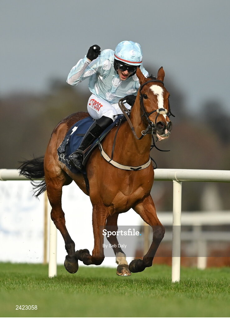 4 February 2023; Gala Marceau, with Danny Mullins up, on their way to winning the Donohue Marquees Spring Juvenile Hurdle on day one of the Dublin Racing Festival at Leopardstown Racecourse in Dublin. Photo by Seb Daly/Sportsfile