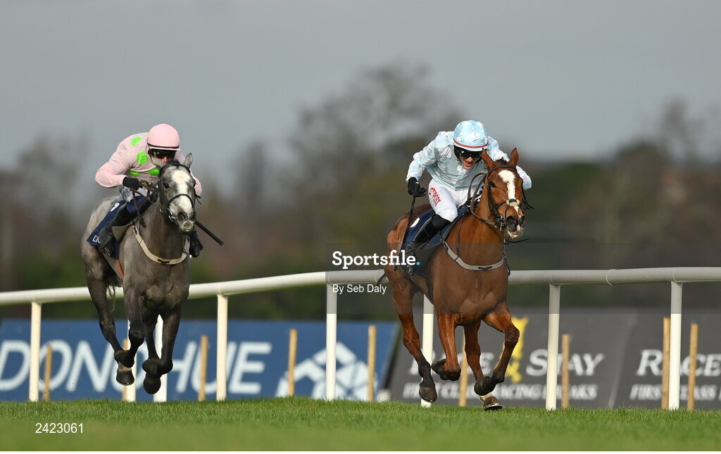 4 February 2023; Gala Marceau, right, with Danny Mullins up, on their way to winning the Donohue Marquees Spring Juvenile Hurdle, from second place Lossiemouth, left, with Paul Townend up, on day one of the Dublin Racing Festival at Leopardstown Racecourse in Dublin. Photo by Seb Daly/Sportsfile