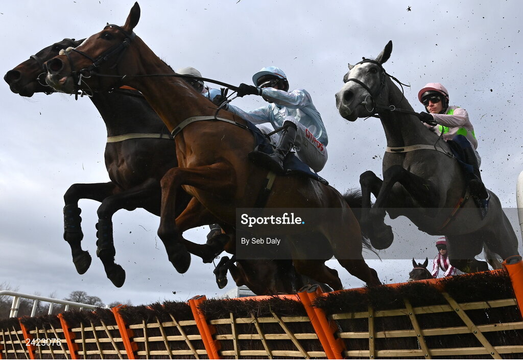 4 February 2023; Gala Marceau, centre, with Danny Mullins up, jumps the first on their way to winning the Donohue Marquees Spring Juvenile Hurdle, from eventual second place Lossiemouth, right, with Paul Townend up, on day one of the Dublin Racing Festival at Leopardstown Racecourse in Dublin. Photo by Seb Daly/Sportsfile