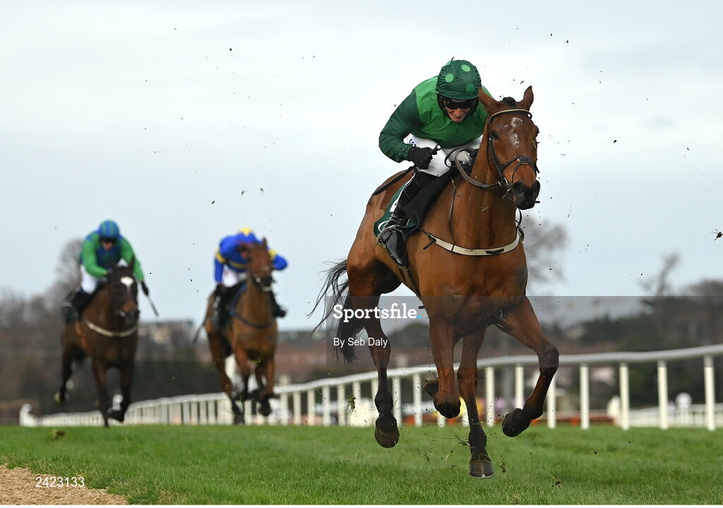 4 February 2023; Jockey Daryl Jacob celebrates as he crosses the line on El Fabiolo to win the Goffs Irish Arkle Novice Steeplechase on day one of the Dublin Racing Festival at Leopardstown Racecourse in Dublin. Photo by Seb Daly/Sportsfile