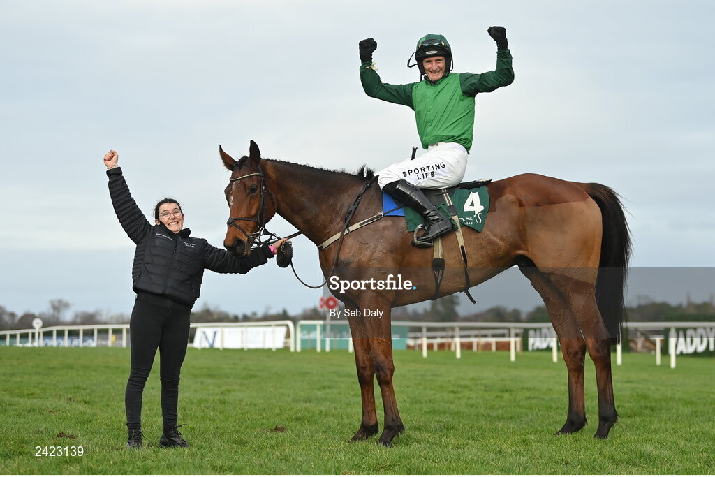 4 February 2023; Jockey Daryl Jacob and groom Youna Samson celebrate with El Fabiolo after winning the Goffs Irish Arkle Novice Steeplechase on day one of the Dublin Racing Festival at Leopardstown Racecourse in Dublin. Photo by Seb Daly/Sportsfile