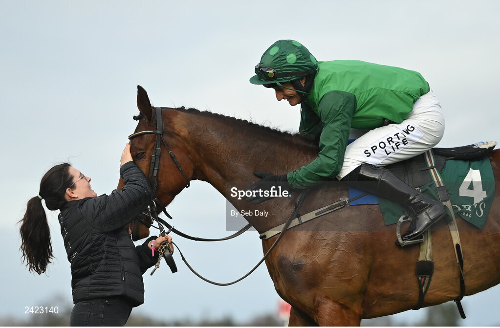 4 February 2023; Jockey Daryl Jacob and groom Youna Samson celebrate with El Fabiolo after winning the Goffs Irish Arkle Novice Steeplechase on day one of the Dublin Racing Festival at Leopardstown Racecourse in Dublin. Photo by Seb Daly/Sportsfile