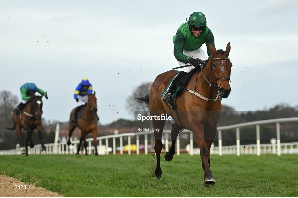 4 February 2023; Jockey Daryl Jacob celebrates as he crosses the line on El Fabiolo to win the Goffs Irish Arkle Novice Steeplechase on day one of the Dublin Racing Festival at Leopardstown Racecourse in Dublin. Photo by Seb Daly/Sportsfile