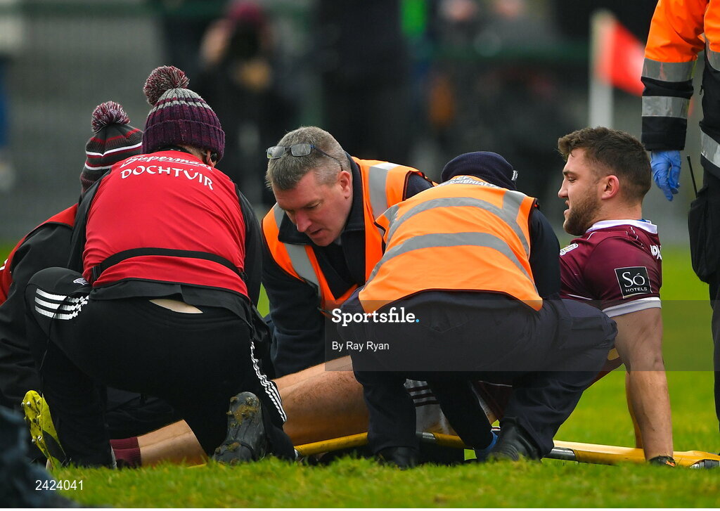 5 February 2023; Damien Comer of Galway receives treatment after sustaining an injury during the Allianz Football League Division 1 match between Galway and Roscommon at Pearse Stadium in Galway. Photo by Ray Ryan/Sportsfile