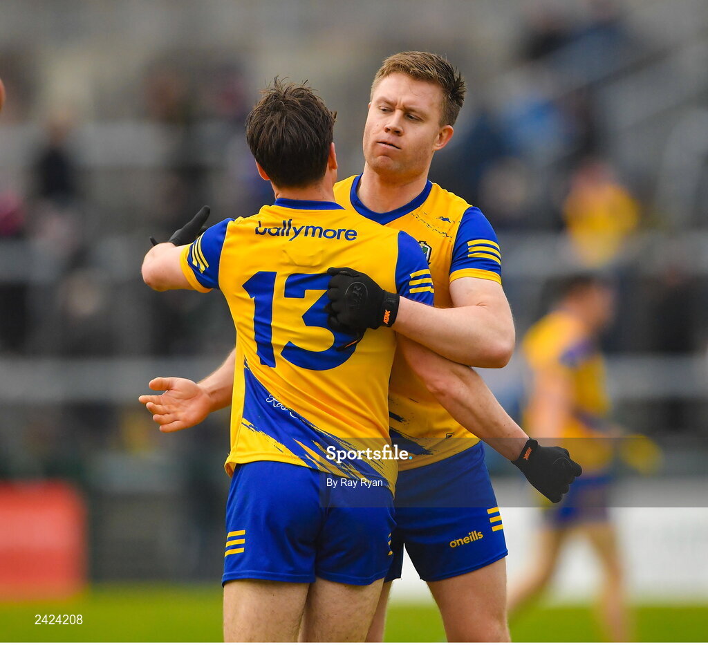 5 February 2023; Niall Daly and Ben O’Carroll of Roscommon celebrate after the game in the Allianz Football League Division 1 match between Galway and Roscommon at Pearse Stadium in Galway. Photo by Ray Ryan/Sportsfile