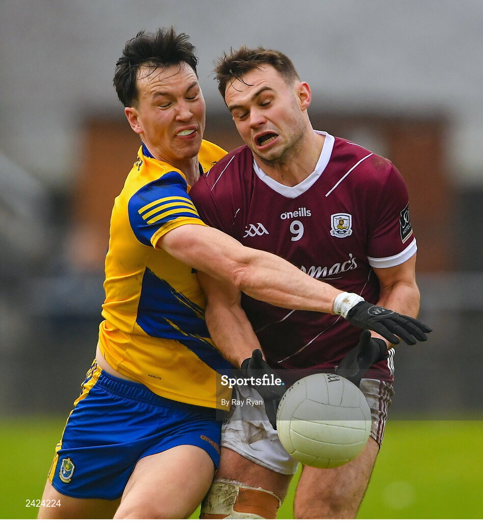 5 February 2023; Tadhg O’Rourke of Roscommon fits the ball away from Cillian McDaid of Galway during the Allianz Football League Division 1 match between Galway and Roscommon at Pearse Stadium in Galway. Photo by Ray Ryan/Sportsfile