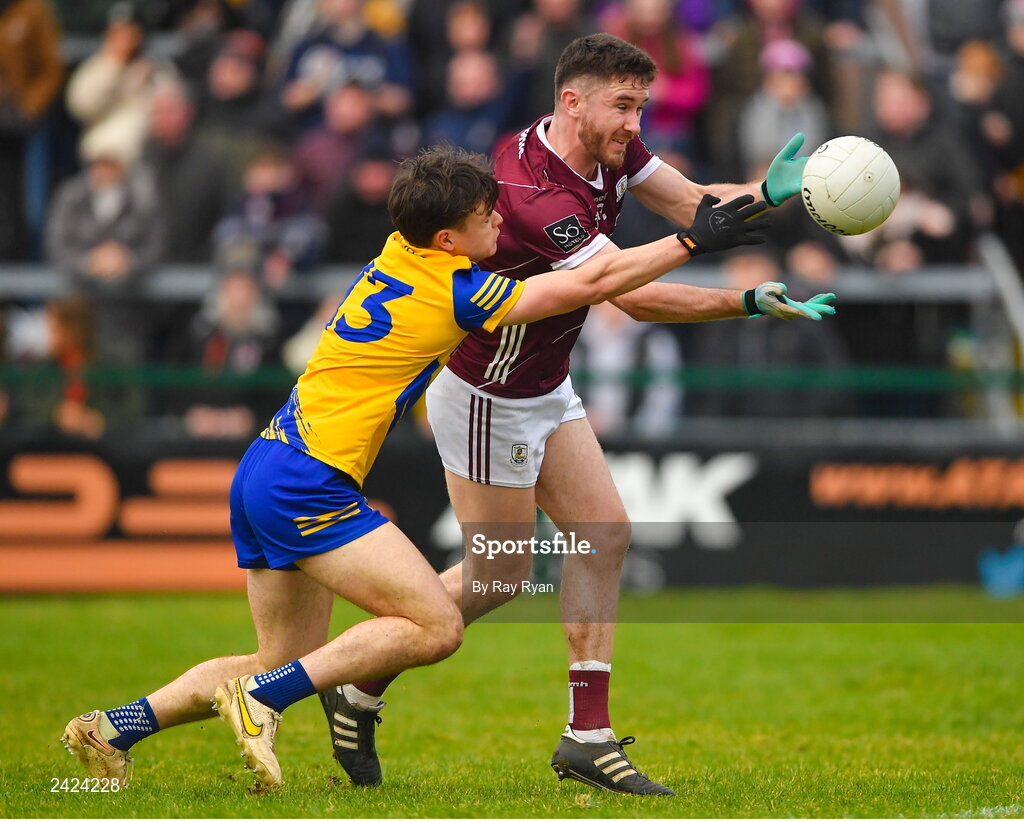 5 February 2023; Eoghan Kelly of Galway in action against Ben O’Carroll of Roscommon during the Allianz Football League Division 1 match between Galway and Roscommon at Pearse Stadium in Galway. Photo by Ray Ryan/Sportsfile