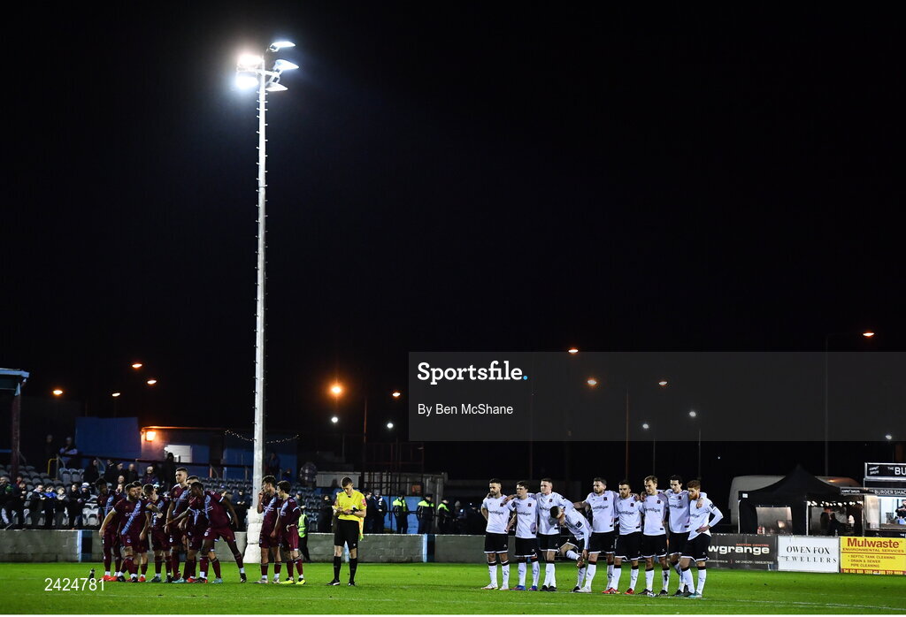 3 February 2023; Players of both side's await the start of the penalty shootout during the Jim Malone Cup match between Drogheda United and Dundalk at Weaver's Park in Drogheda, Louth. Photo by Ben McShane/Sportsfile