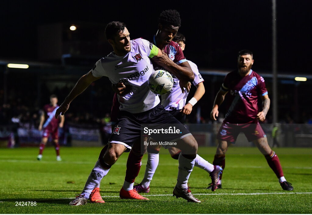 3 February 2023; Patrick Hoban of Dundalk and Elicha Ahui of Drogheda United during the Jim Malone Cup match between Drogheda United and Dundalk at Weaver's Park in Drogheda, Louth. Photo by Ben McShane/Sportsfile