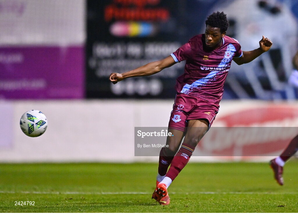 3 February 2023; Elicha Ahui of Drogheda United during the Jim Malone Cup match between Drogheda United and Dundalk at Weaver's Park in Drogheda, Louth. Photo by Ben McShane/Sportsfile