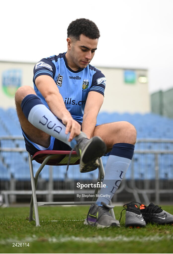 4 February 2023; Evan Osam removed his boots after the UCD squad photo during a UCD squad portrait session at UCD Bowl in Dublin. Photo by Stephen McCarthy/Sportsfile