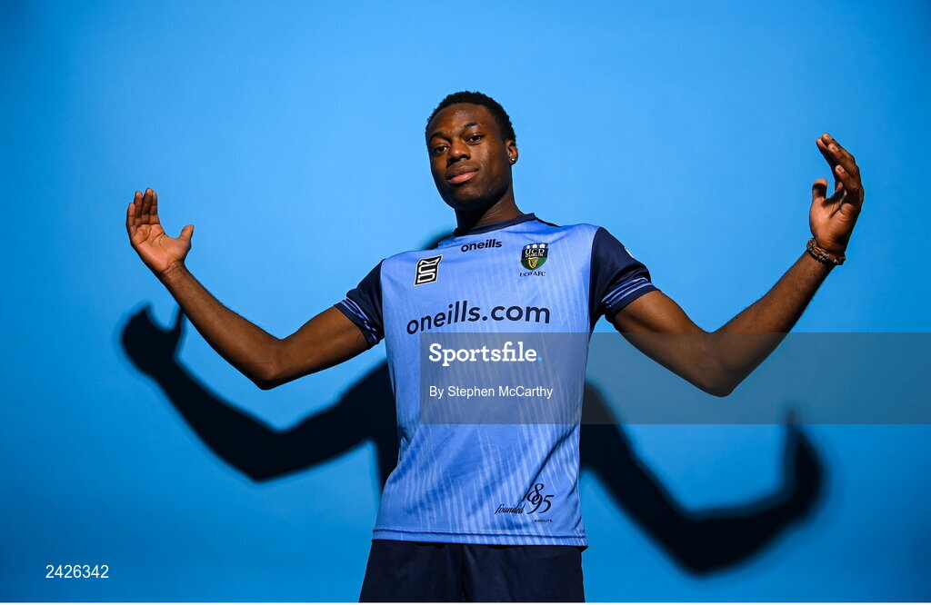 4 February 2023; Divine Izekor poses for a portrait during a UCD squad portrait session at UCD Bowl in Dublin. Photo by Stephen McCarthy/Sportsfile