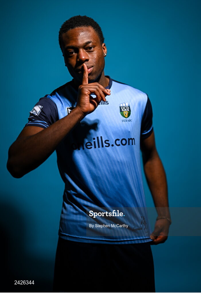 4 February 2023; Divine Izekor poses for a portrait during a UCD squad portrait session at UCD Bowl in Dublin. Photo by Stephen McCarthy/Sportsfile