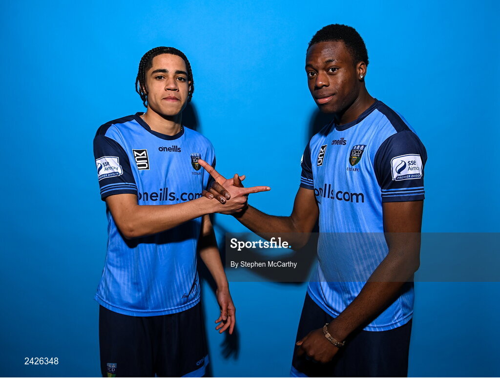 4 February 2023; Daniel Babb, left, and Divine Izekor pose for a portrait during a UCD squad portrait session at UCD Bowl in Dublin. Photo by Stephen McCarthy/Sportsfile
