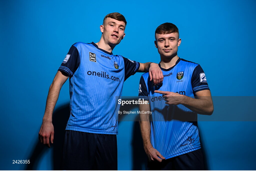 4 February 2023; Alex Nolan, left, and Adam Wells pose for a portrait during a UCD squad portrait session at UCD Bowl in Dublin. Photo by Stephen McCarthy/Sportsfile