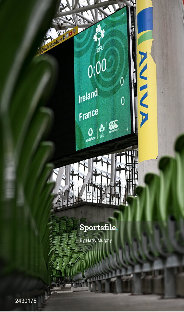 11 February 2023; A general view of the scoreboard before the Guinness Six Nations Rugby Championship match between Ireland and France at the Aviva Stadium in Dublin. Photo by Harry Murphy/Sportsfile