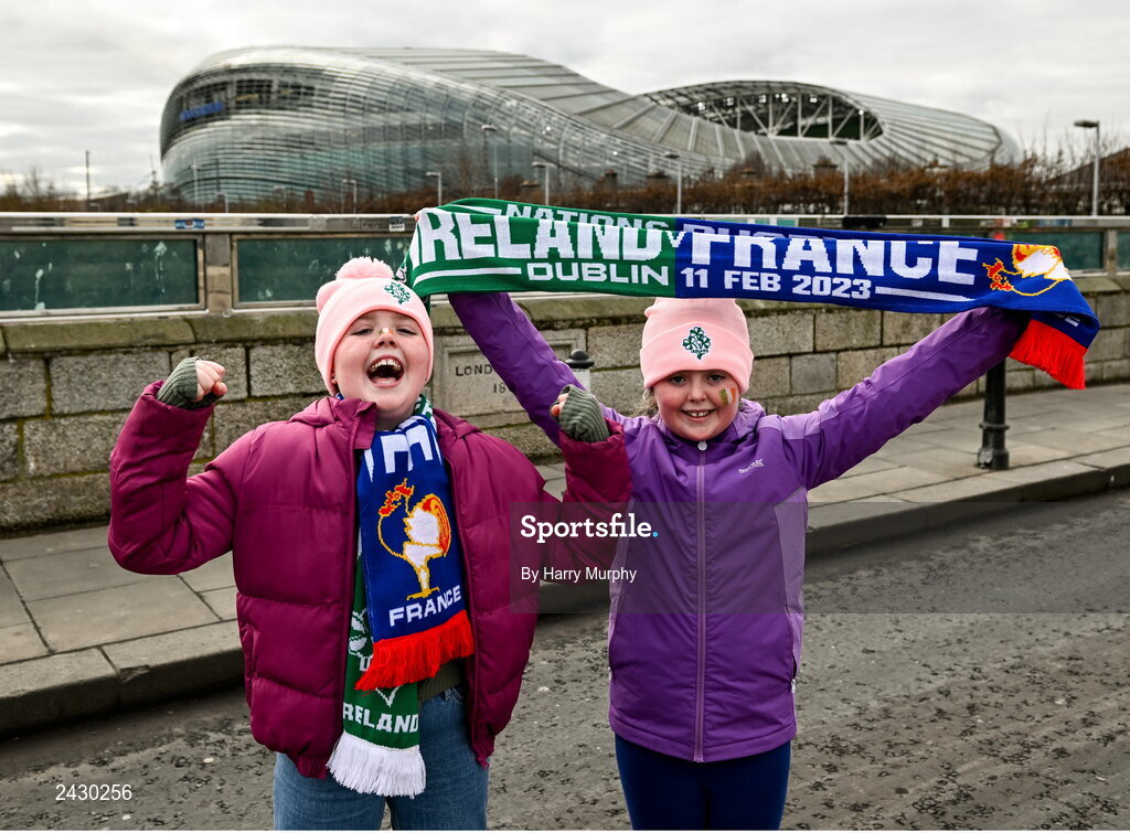 11 February 2023; Ireland supporters Isobel and Payton O'Gorman, from Naas, Kildare, before the Guinness Six Nations Rugby Championship match between Ireland and France at the Aviva Stadium in Dublin. Photo by Harry Murphy/Sportsfile
