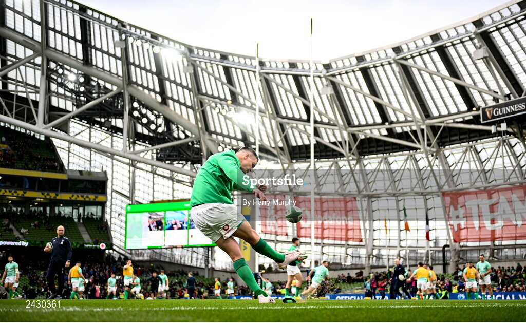 11 February 2023; Ireland captain Jonathan Sexton warms-up before the Guinness Six Nations Rugby Championship match between Ireland and France at the Aviva Stadium in Dublin. Photo by Harry Murphy/Sportsfile