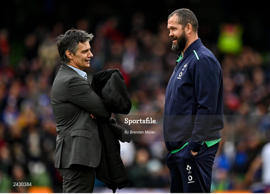 11 February 2023; Ireland head coach Andy Farrell, right, speaks with World Rugby head of match officials Joël Jutge before the Guinness Six Nations Rugby Championship match between Ireland and France at the Aviva Stadium in Dublin. Photo by Brendan Moran/Sportsfile
