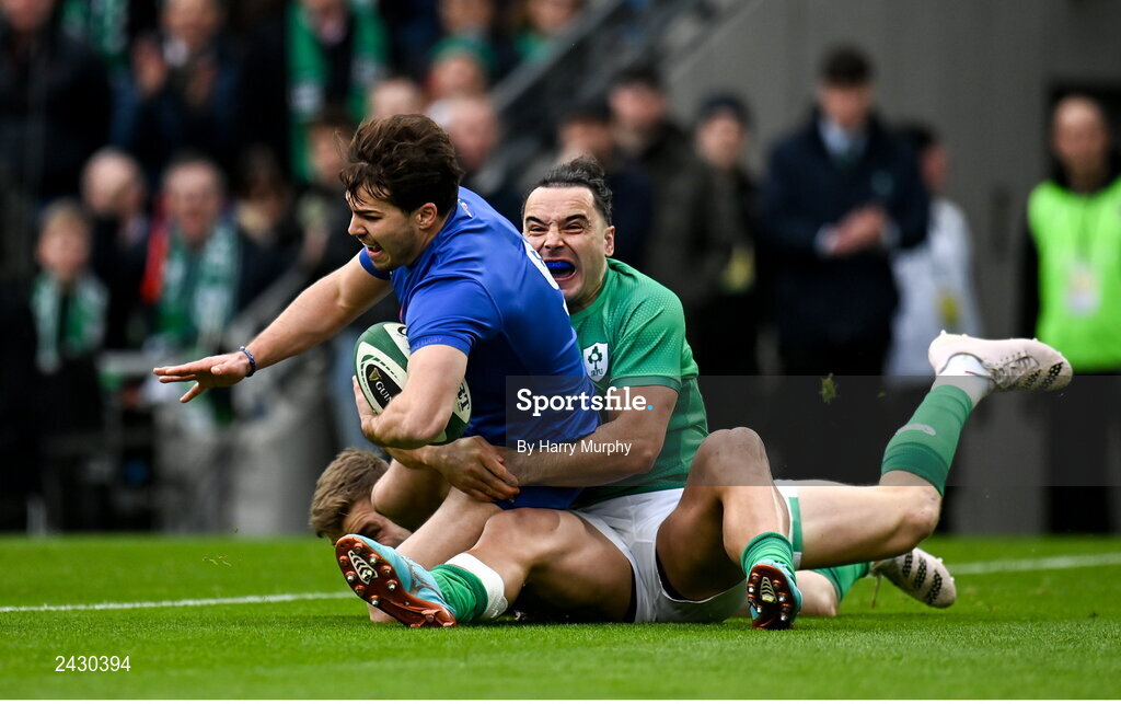 11 February 2023; Antoine Dupont of France is tackled by James Lowe of Ireland during the Guinness Six Nations Rugby Championship match between Ireland and France at the Aviva Stadium in Dublin. Photo by Harry Murphy/Sportsfile