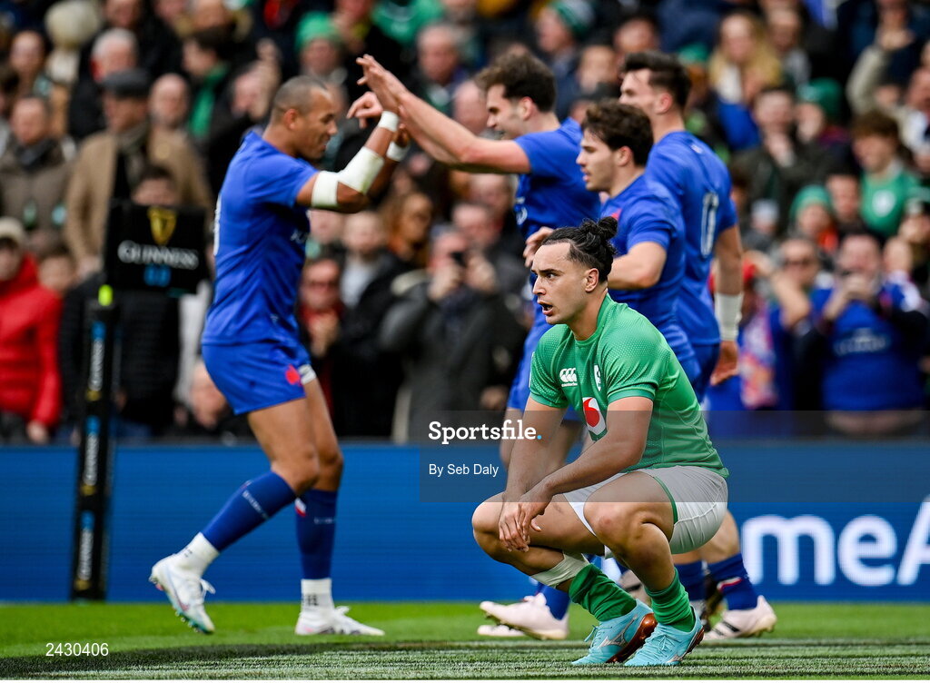11 February 2023; James Lowe of Ireland reacts after his team concede their first try during the Guinness Six Nations Rugby Championship match between Ireland and France at the Aviva Stadium in Dublin. Photo by Seb Daly/Sportsfile