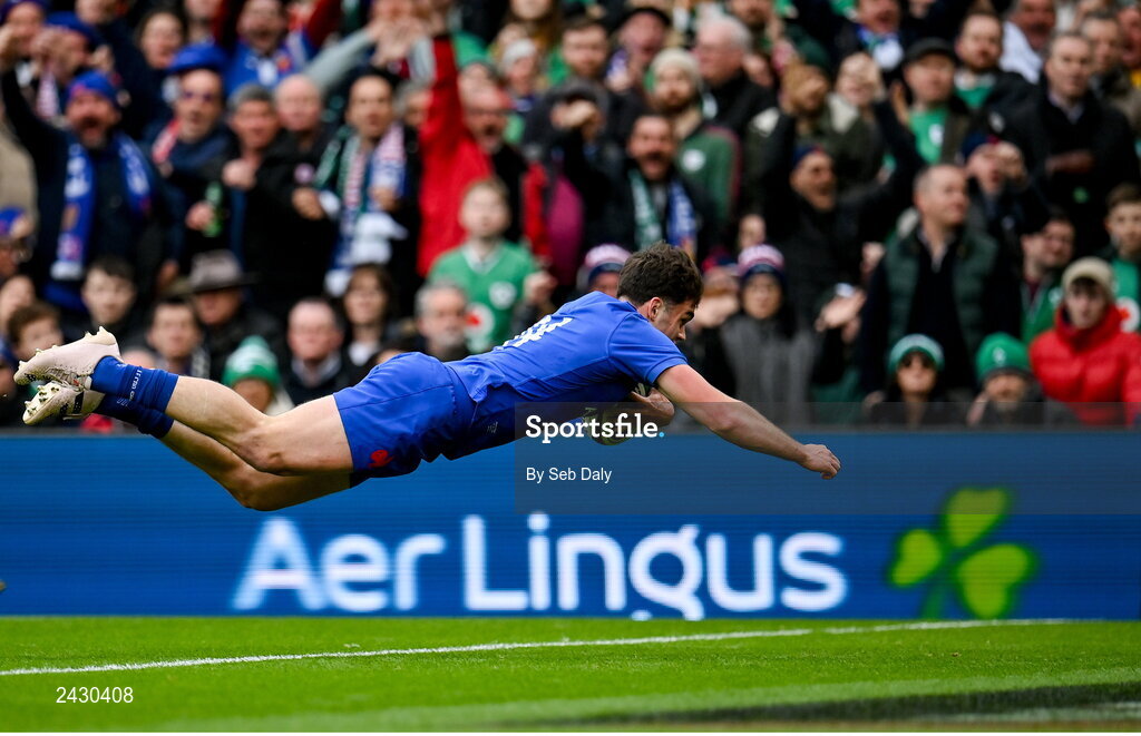 11 February 2023; Damian Penaud of France dives over to score his side's first try during the Guinness Six Nations Rugby Championship match between Ireland and France at the Aviva Stadium in Dublin. Photo by Seb Daly/Sportsfile